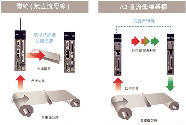 多軸共直流母線設(shè)計,保持直流母線電壓穩(wěn)定,回生能量再利用,機(jī)械設(shè)備更節(jié)能多臺驅(qū)動器使用共直流母線功能,節(jié)省煞車電阻使用數(shù)量,降低成本
