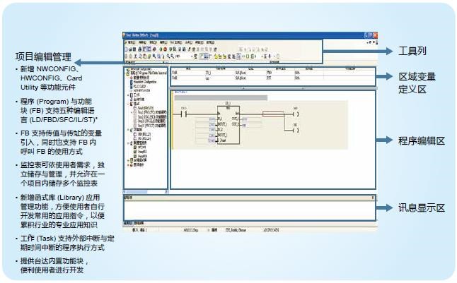 整合運動控制編輯:ISPSoft V3將邏輯編程與運動編程整合在同一套軟件上,并提供符合國際標(biāo)準(zhǔn)規(guī)格 PLCopen? 的功能塊以及臺達(dá)提供的豐富功能塊