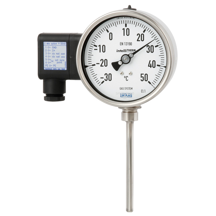 該型號溫度計在高質量機械式溫度測量儀表中集成了威卡(WIKA)電子變送器,既有電子信號的傳輸又具備就地機械顯示的優(yōu)勢。