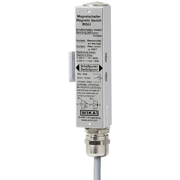 BGU型式磁性開關(guān)用于磁翻柱式液位計(jì)的液位高度限位檢測。開關(guān)動作時(shí)產(chǎn)生一個(gè)二進(jìn)制信號,供給下游電路使用或控制設(shè)備。雙穩(wěn)態(tài)磁性開關(guān)可保持住信號。